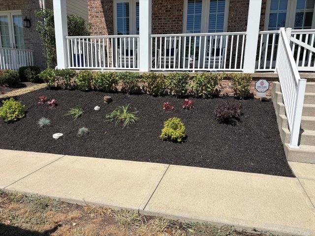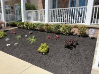Removed Existing Grass. Installed weed block paper, new shrubs and new mulch.